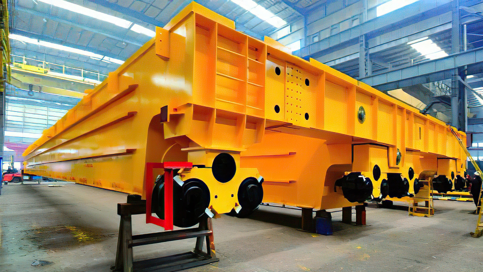 3、桥架结构为三梁四轨设计,主、副梁均采用宽翼缘偏轨箱形结构;